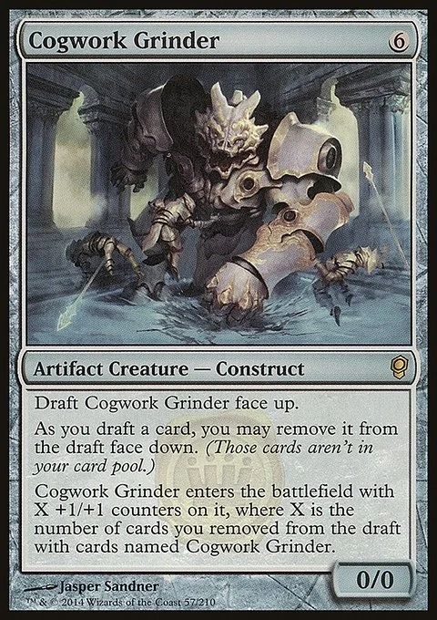 Cogwork Grinder enters the battlefield with X +1/+1 counters on it, where X is the number of cards you removed from the draft with cards named Cogwork Grinder.