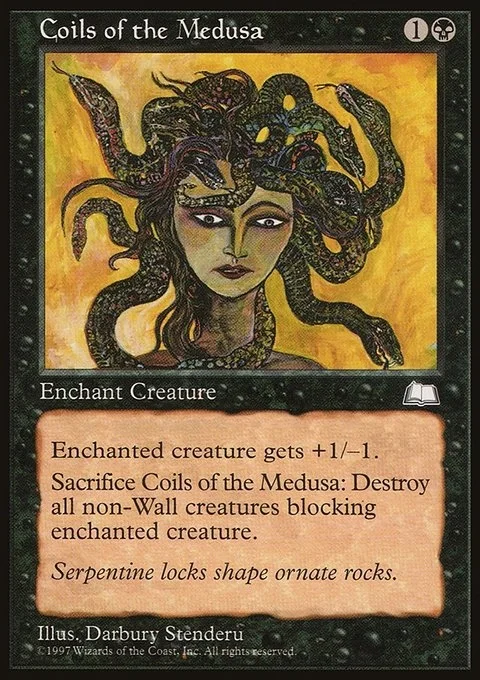 Enchant creature Enchanted creature gets +1/-1. Sacrifice Coils of the Medusa: Destroy all non-Wall creatures blocking enchanted creature.