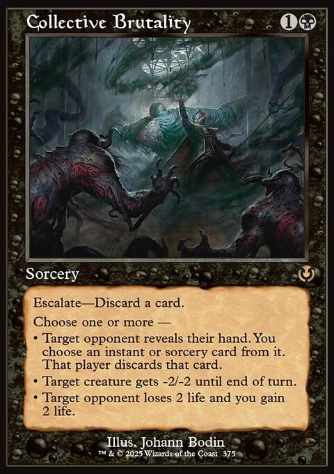 Escalate—Discard a card. (Pay this cost for each mode chosen beyond the first.) Choose one or more — • Target opponent reveals their hand. You choose an instant or sorcery card from it. That player discards that card. • Target creature gets -2/-2 until end of turn. • Target opponent loses 2 life and you gain 2 life.