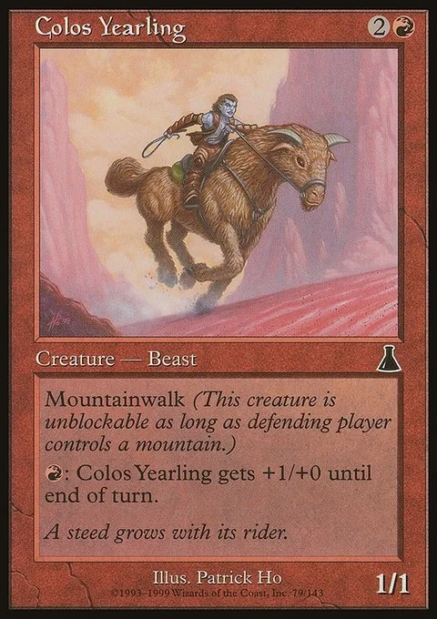 Mountainwalk (This creature can't be blocked as long as defending player controls a Mountain.) {R}: Colos Yearling gets +1/+0 until end of turn.