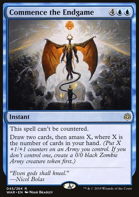 This spell can't be countered. Draw two cards, then amass Zombies X, where X is the number of cards in your hand. (Put X +1/+1 counters on an Army you control. It's also a Zombie. If you don't control an Army, create a 0/0 black Zombie Army creature token first.)