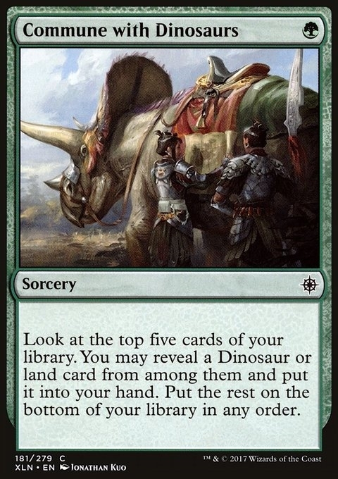 Look at the top five cards of your library. You may reveal a Dinosaur or land card from among them and put it into your hand. Put the rest on the bottom of your library in any order.