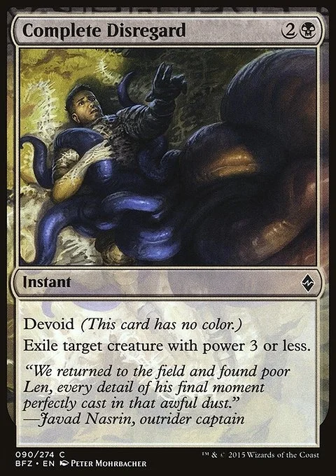 Devoid (This card has no color.) Exile target creature with power 3 or less.
