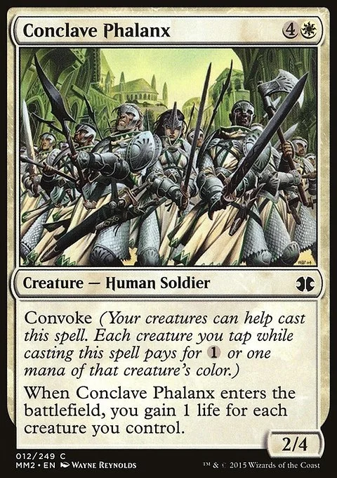Convoke (Your creatures can help cast this spell. Each creature you tap while casting this spell pays for {1} or one mana of that creature's color.) When Conclave Phalanx enters the battlefield, you gain 1 life for each creature you control.
