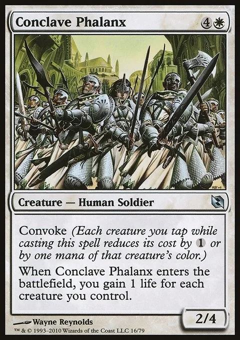 Convoke (Your creatures can help cast this spell. Each creature you tap while casting this spell pays for {1} or one mana of that creature's color.) When Conclave Phalanx enters, you gain 1 life for each creature you control.