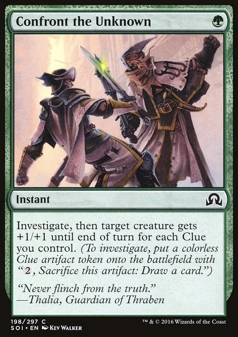 Investigate, then target creature gets +1/+1 until end of turn for each Clue you control. (Create a Clue token. It's an artifact with "{2}, Sacrifice this token: Draw a card.")