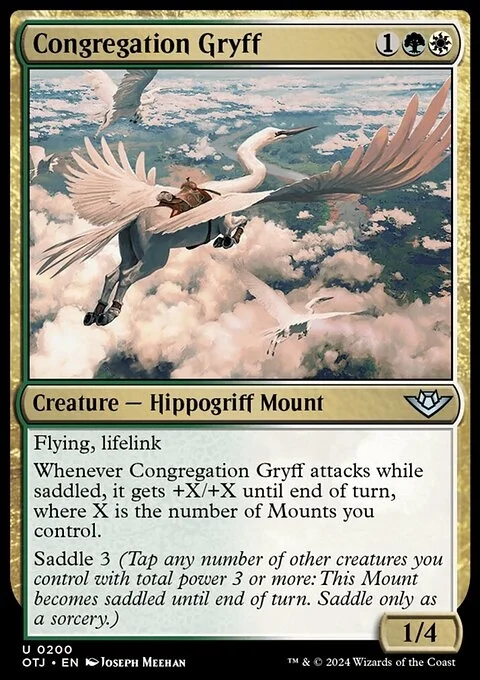 Whenever Congregation Gryff attacks while saddled, it gets +X/+X until end of turn, where X is the number of Mounts you control.