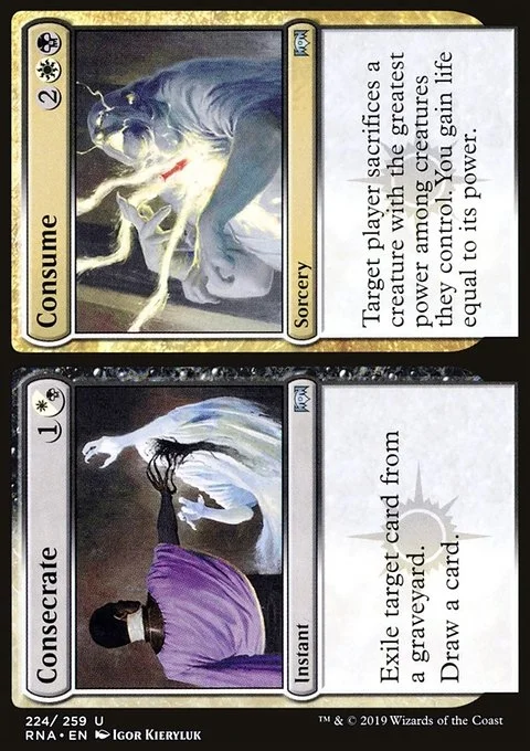 Consecrate Exile target card from a graveyard. Draw a card. Consume Target player sacrifices a creature with the greatest power among creatures they control. You gain life equal to its power.