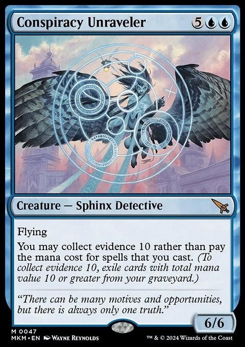 Flying You may collect evidence 10 rather than pay the mana cost for spells you cast. (To collect evidence 10, exile cards with total mana value 10 or greater from your graveyard.)