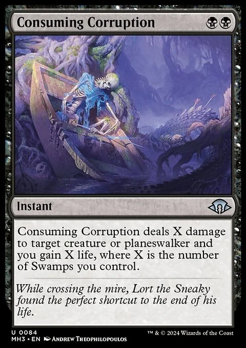 Consuming Corruption deals X damage to target creature or planeswalker and you gain X life, where X is the number of Swamps you control.