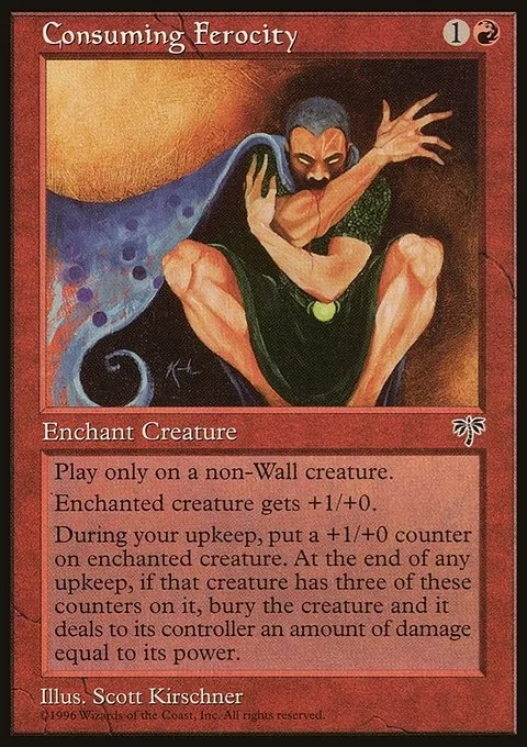Play only on a non-Wall creature.Enchanted creature gets +1/+0.During your upkeep, put a +1/+0 counter on enchanted creature. At the end of any upkeep, if that creature has three of these counters on it, bury the creature and it deals to its controller an amount of damage equal to its power.
