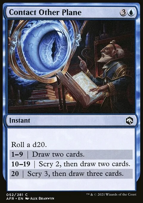 Roll a d20. 1—9 | Draw two cards. 10—19 | Scry 2, then draw two cards. 20 | Scry 3, then draw three cards.