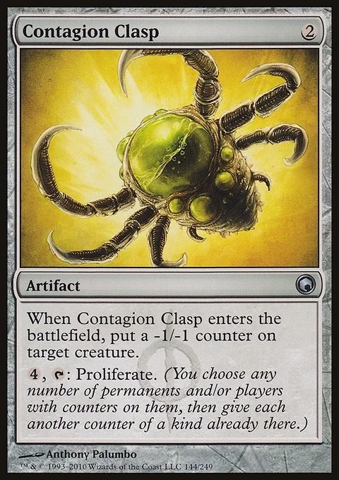 When Contagion Clasp enters the battlefield, put a -1/-1 counter on target creature. {4}, {T}: Proliferate. (Choose any number of permanents and/or players, then give each another counter of each kind already there.)