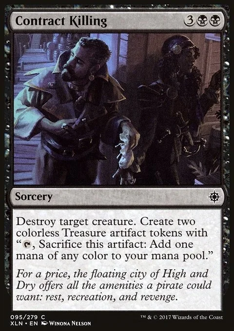 Destroy target creature. Create two Treasure tokens. (They're artifacts with "{T}, Sacrifice this token: Add one mana of any color.")