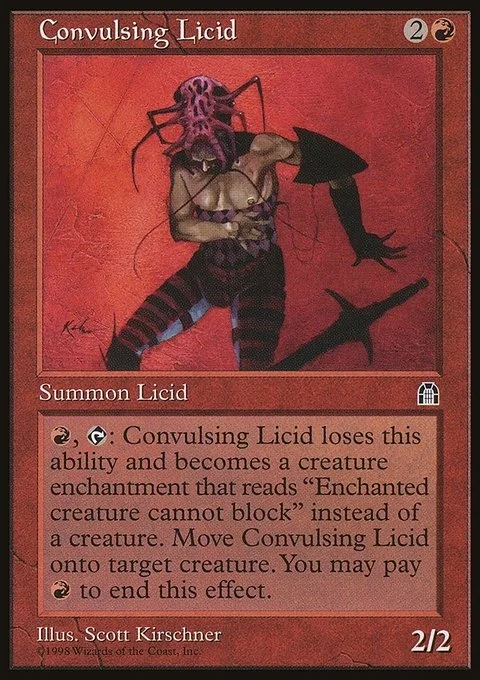 R, T: Convulsing Licid loses this ability and becomes a creature enchantment that reads “Enchanted creature cannot block” instead of a creature. Move Convulsing Licid onto target creature. You may pay R to end this effect.