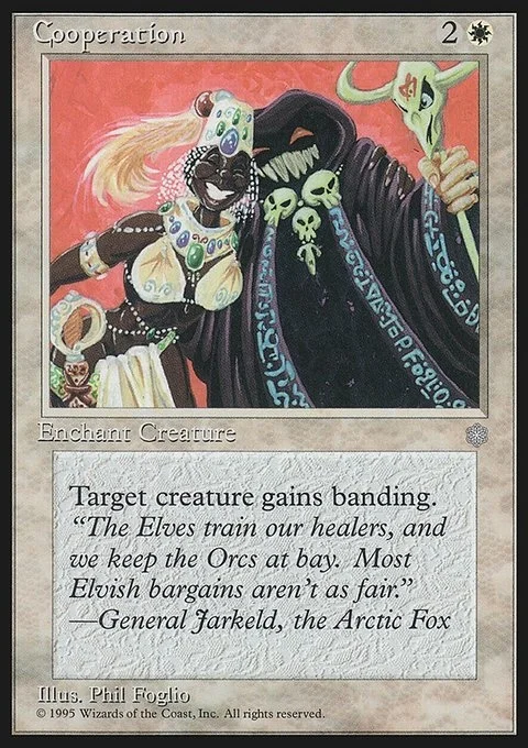 Enchanted creature has banding. (Any creatures with banding, and up to one without, can attack in a band. Bands are blocked as a group. If any creatures with banding a player controls are blocking or being blocked by a creature, that player divides that creature's combat damage, not its controller, among any of the creatures it's being blocked by or is blocking.)