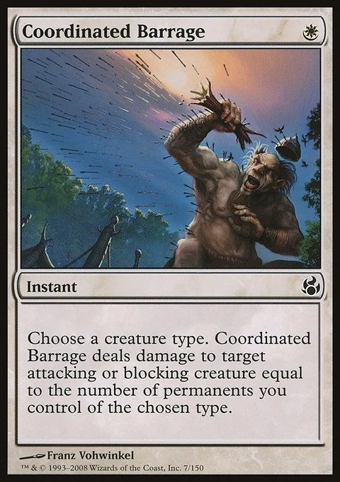 Choose a creature type. Coordinated Barrage deals damage to target attacking or blocking creature equal to the number of permanents you control of the chosen type.