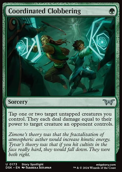 Tap one or two target untapped creatures you control. They each deal damage equal to their power to target creature an opponent controls.