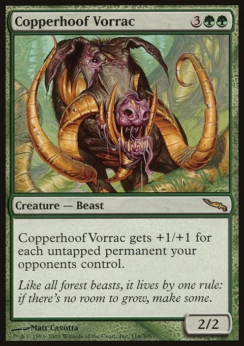 Copperhoof Vorrac gets +1/+1 for each untapped permanent your opponents control.