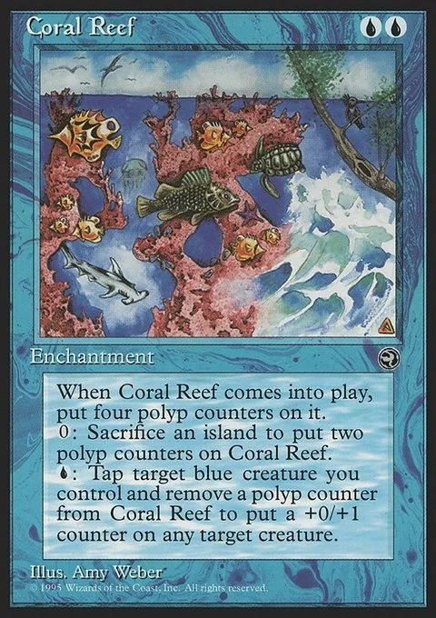 {U}, Tap an untapped blue creature you control, Remove a polyp counter from Coral Reef: Put a +0/+1 counter on target creature.