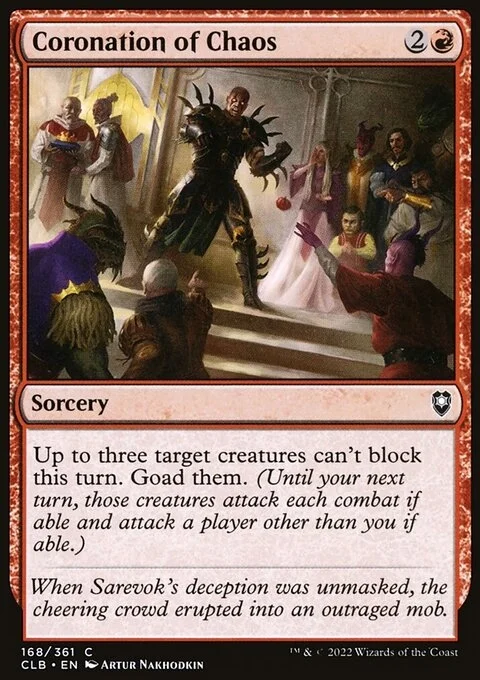 Up to three target creatures can't block this turn. Goad them. (Until your next turn, those creatures attack each combat if able and attack a player other than you if able.)