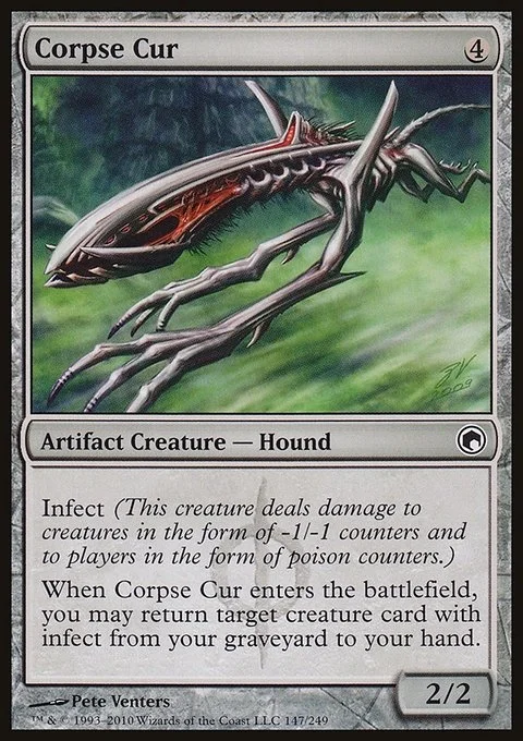 Infect (This creature deals damage to creatures in the form of -1/-1 counters and to players in the form of poison counters.) When Corpse Cur enters the battlefield, you may return target creature card with infect from your graveyard to your hand.