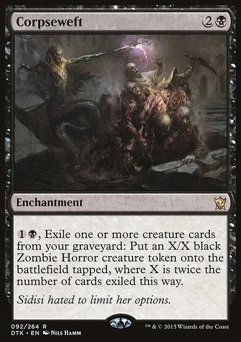 {1}{B}, Exile one or more creature cards from your graveyard: Create a tapped X/X black Zombie Horror creature token, where X is twice the number of cards exiled this way.