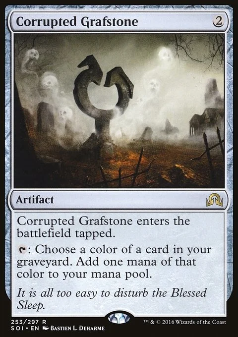 Corrupted Grafstone enters the battlefield tapped. {T}: Choose a color of a card in your graveyard. Add one mana of that color.