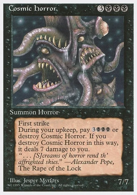 First strikeDuring your upkeep, pay 3BBB or destroy Cosmic Horror. If you destroy Cosmic Horror in this way, it deals 7 damage to you.