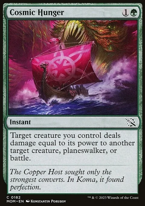 Target creature you control deals damage equal to its power to another target creature, planeswalker, or battle.