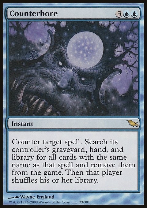 Counter target spell. Search its controller's graveyard, hand, and library for all cards with the same name as that spell and remove them from the game. Then that player shuffles his or her library.