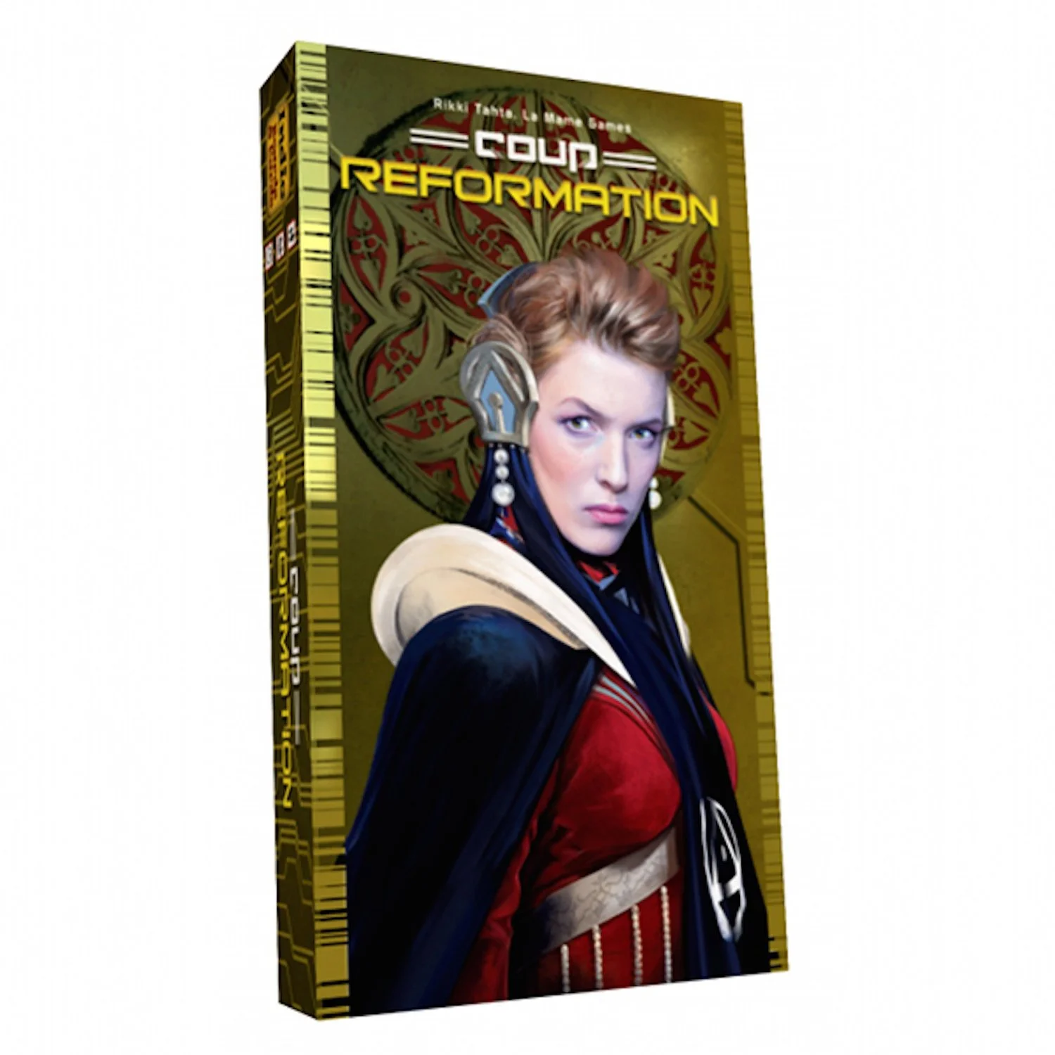 Coup: Reformation, an expansion for the original version of Coup: City State from La Mame Games, adds new cards to the game and rules for factions and team play that increases tension in the early stages for four or more players and (thanks to 15 additional character cards) allows Coup to be better played with up to ten players.
