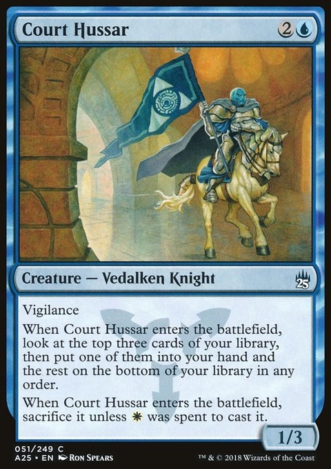 When Court Hussar enters the battlefield, look at the top three cards of your library, then put one of them into your hand and the rest on the bottom of your library in any order.