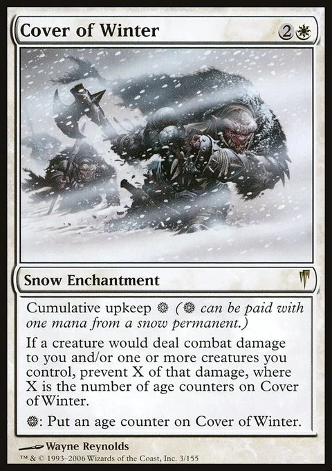 If a creature would deal combat damage to you and/or one or more creatures you control, prevent X of that damage, where X is the number of age counters on Cover of Winter.