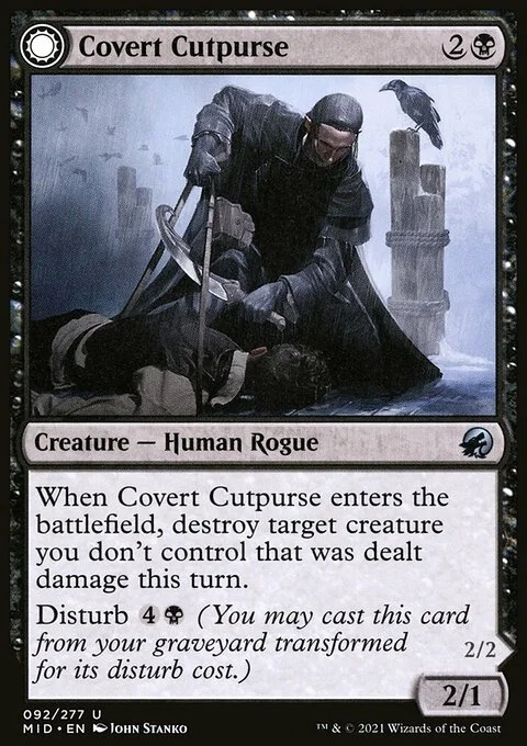 When Covert Cutpurse enters the battlefield, destroy target creature you don't control that was dealt damage this turn.