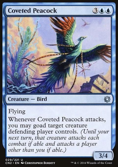 Whenever Coveted Peacock attacks, you may goad target creature defending player controls. (Until your next turn, that creature attacks each combat if able and attacks a player other than you if able.)