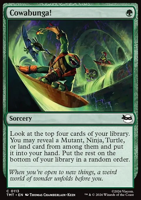 Look at the top four cards of your library. You may reveal a Mutant, Ninja, Turtle, or land card from among them and put it into your hand. Put the rest on the bottom of your library in a random order.