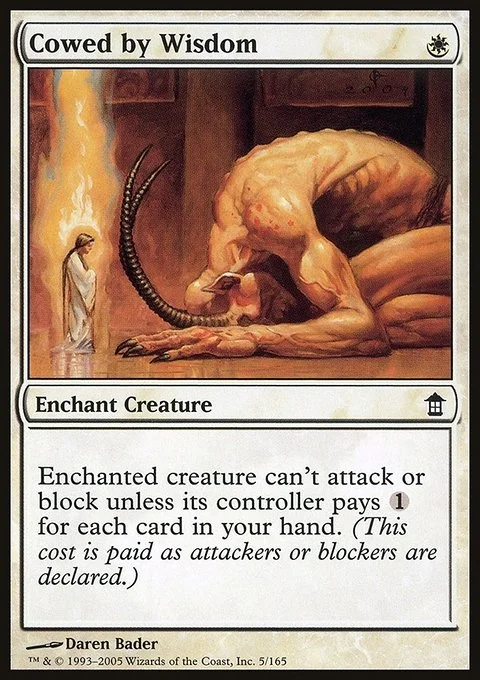 Enchant creature Enchanted creature can't attack or block unless its controller pays {1} for each card in your hand.