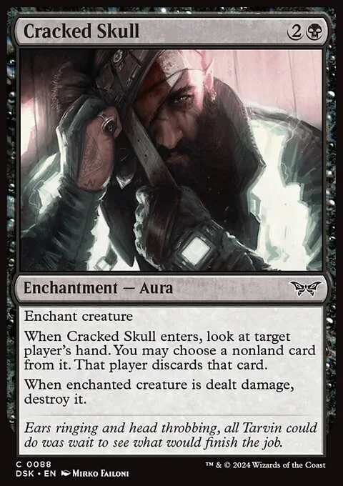 Enchant creature When this Aura enters, look at target player's hand. You may choose a nonland card from it. That player discards that card. When enchanted creature is dealt damage, destroy it.