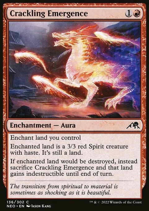 Enchant land you control Enchanted land is a 3/3 red Spirit creature with haste. It's still a land. If enchanted land would be destroyed, instead sacrifice this Aura and that land gains indestructible until end of turn.