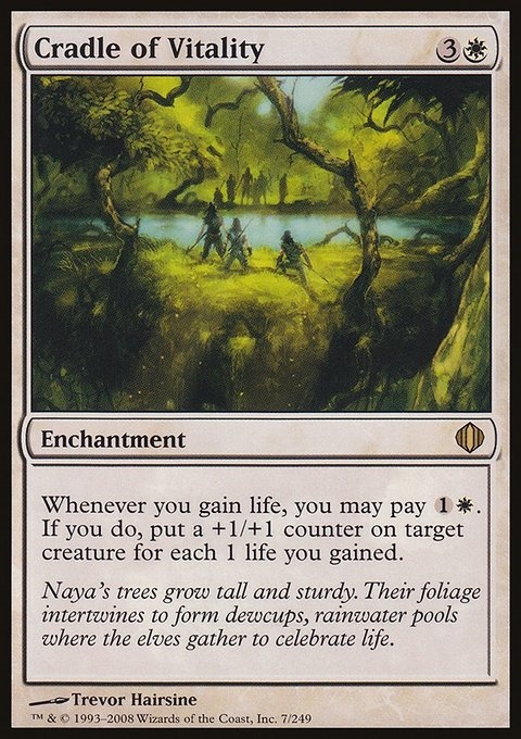 Whenever you gain life, you may pay {1}{W}. If you do, put a +1/+1 counter on target creature for each 1 life you gained.