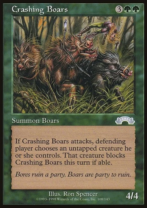 If Crashing Boars attacks, defending player chooses an untapped creature he or she controls. That creature blocks Crashing Boars this turn if able.