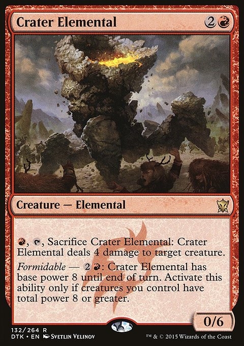 {R}, {T}, Sacrifice Crater Elemental: It deals 4 damage to target creature. Formidable — {2}{R}: Crater Elemental has base power 8 until end of turn. Activate this ability only if creatures you control have total power 8 or greater.