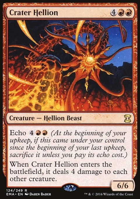 When Crater Hellion enters the battlefield, it deals 4 damage to each other creature.