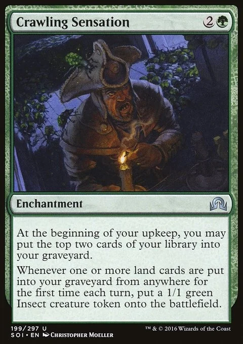 At the beginning of your upkeep, you may mill two cards. Whenever one or more land cards are put into your graveyard from anywhere for the first time each turn, create a 1/1 green Insect creature token.