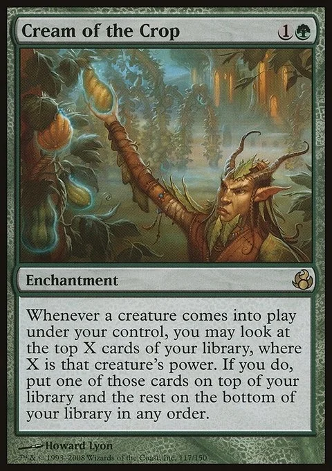 Whenever a creature comes into play under your control, you may look at the top X cards of your library, where X is that creature's power. If you do, put one of those cards on top of your library and the rest on the bottom of your library in any order.