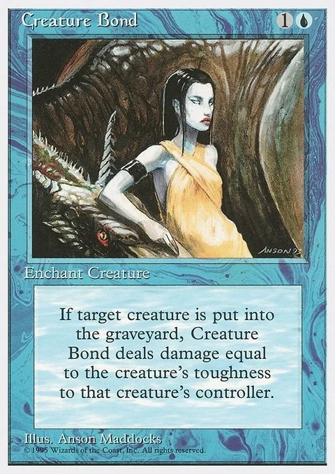 Enchant creature When enchanted creature dies, Creature Bond deals damage equal to that creature's toughness to the creature's controller.