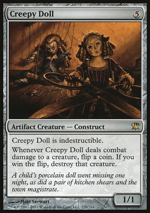 Indestructible Whenever Creepy Doll deals combat damage to a creature, flip a coin. If you win the flip, destroy that creature.