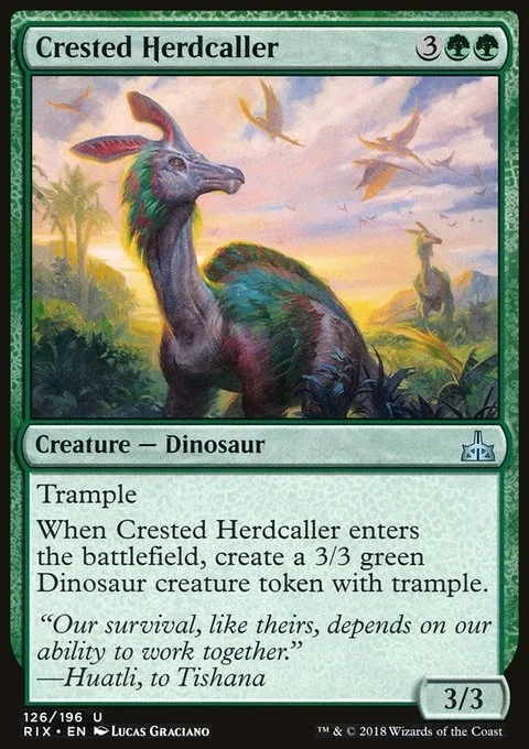 Trample When Crested Herdcaller enters the battlefield, create a 3/3 green Dinosaur creature token with trample.