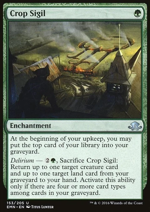 Delirium — {2}{G}, Sacrifice Crop Sigil: Return up to one target creature card and up to one target land card from your graveyard to your hand. Activate only if there are four or more card types among cards in your graveyard.